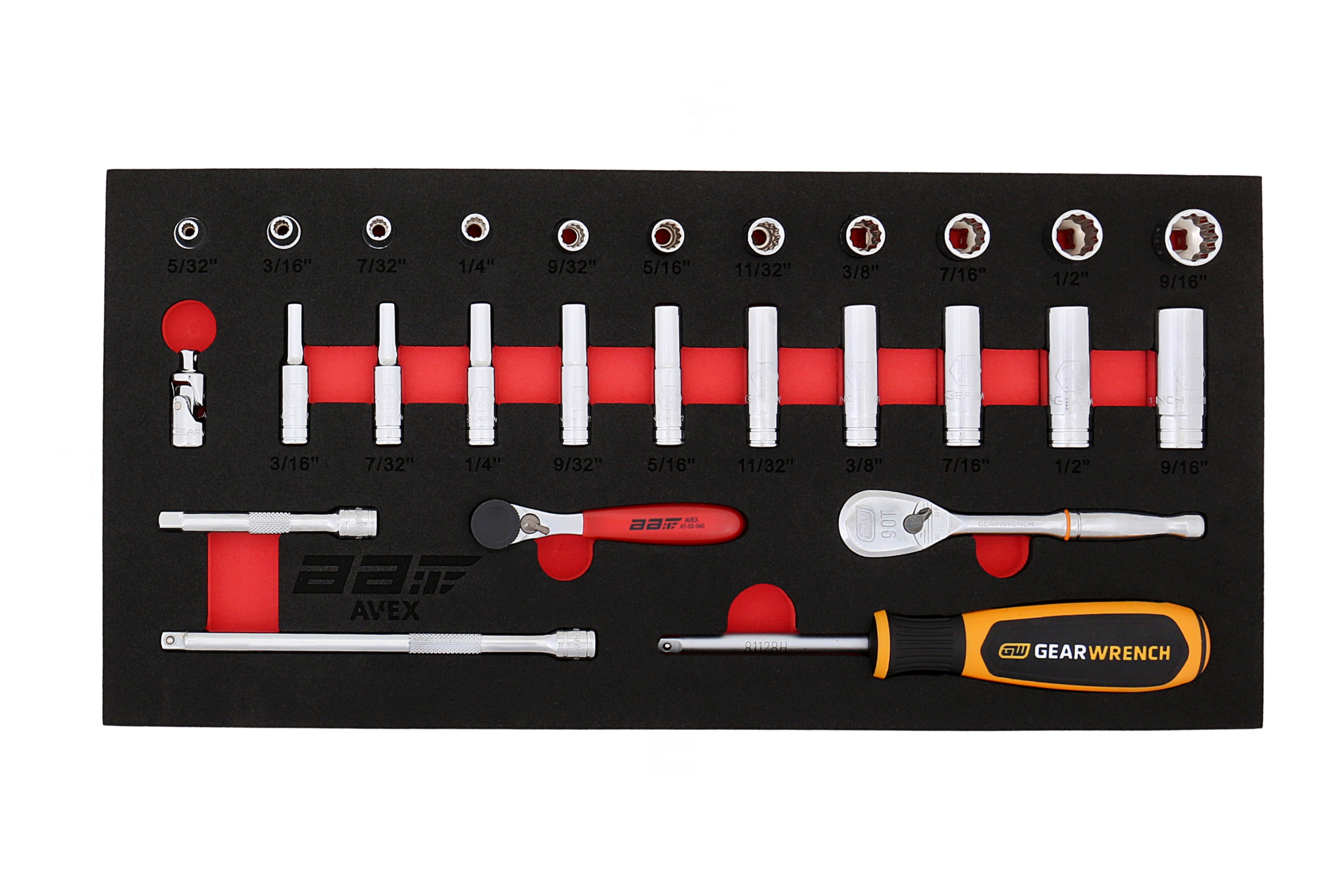 Sockets 1/4"Dr 5/32" to 9/16" Standard 12 Point- Sockets 1/4"Dr 3/16" to 9/16" Deep 12 Point- Extensions 1/4"Dr 3", 5"- Ratchet 1/4"Dr metal handle- Stubby Hex insert 1/4"- Universal Joint 1/4"Dr- Spinner Handle 1/4"Dr-